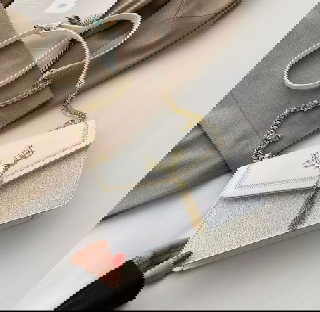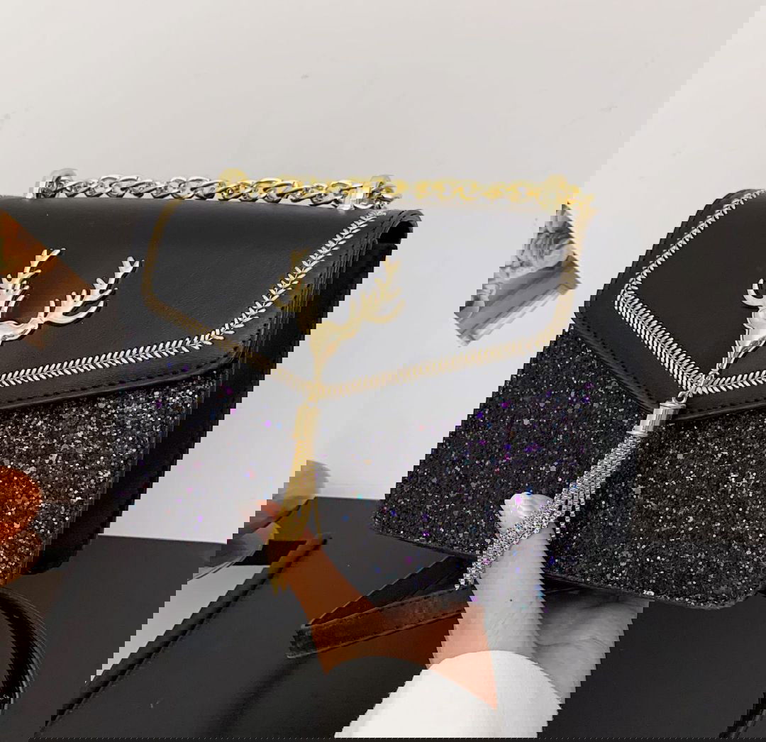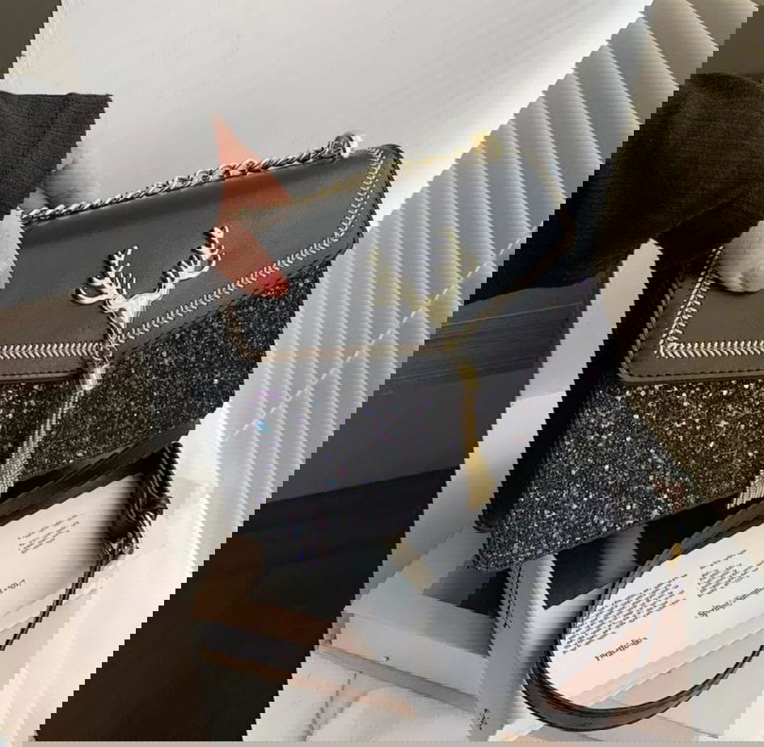 Cartera ciervo negro con dorado y brillos , con cadena y correa extensible