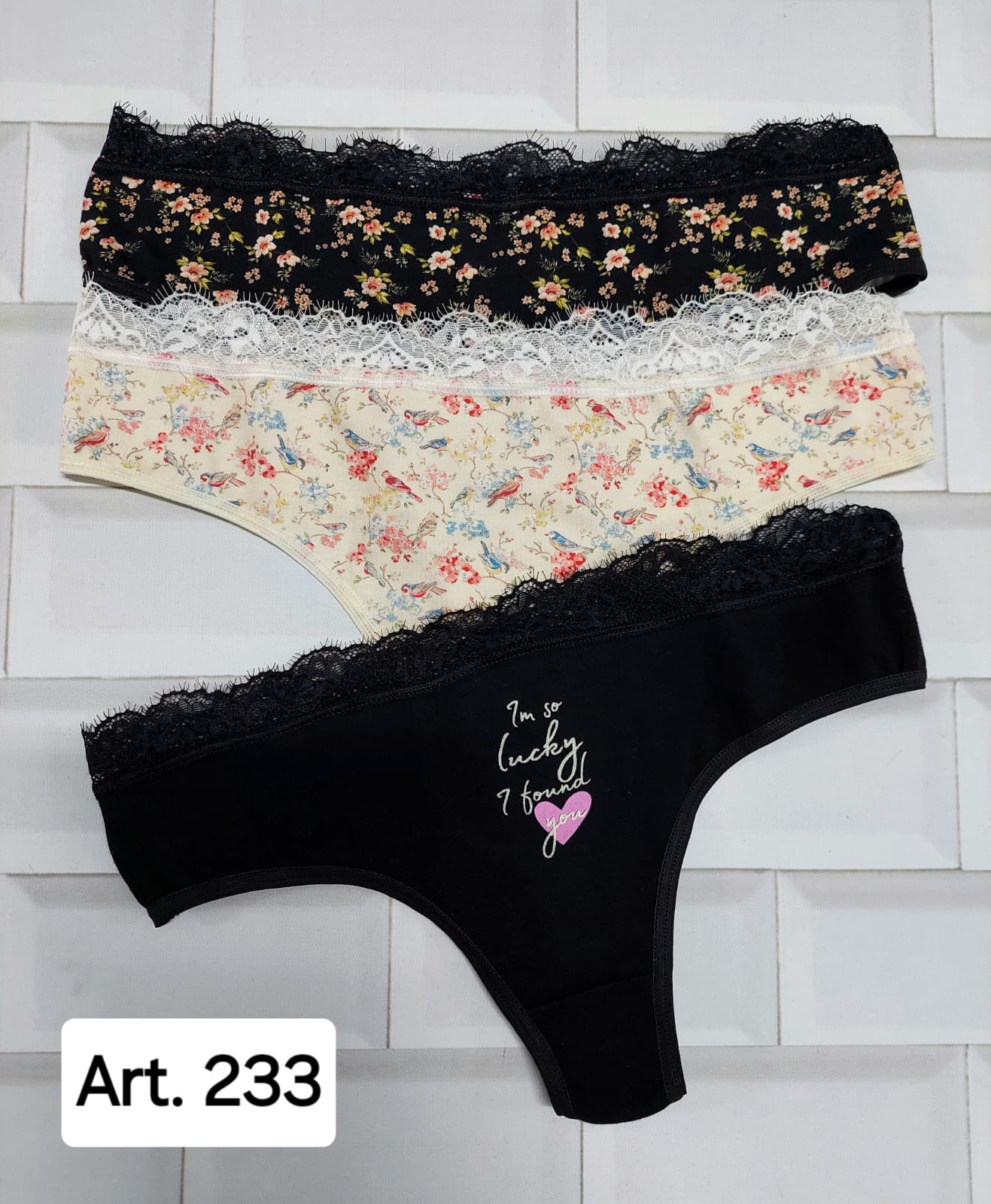 Docena de culotte less de algodon y lycra estampada con puntillas